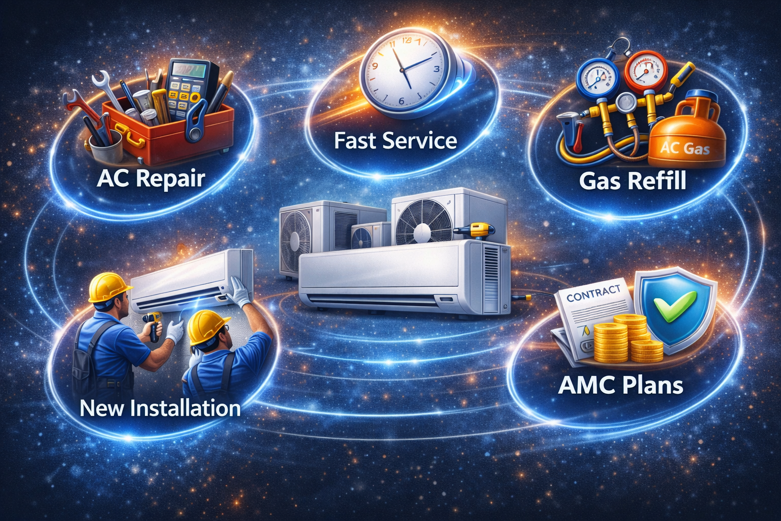 Ab AC ki problem aapka mood kharab nahi karegi! Hum provide karte hain fast, reliable aur affordable AC services — chahe repair ho, gas refill, regular servicing ya new AC installation. Hamare trained technicians same-day visit ke saath aapke ghar ya office par pahunchte hain, original parts use karte hain aur proper testing ke baad hi kaam complete karte hain. Transparent pricing, no hidden charges aur 100% customer satisfaction — ye hi hamari pehchaan hai.